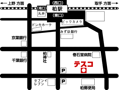 「柏駅」東口を出て、大通りを直進、みずほ銀行前の通りを直進し2つ目の信号を左折